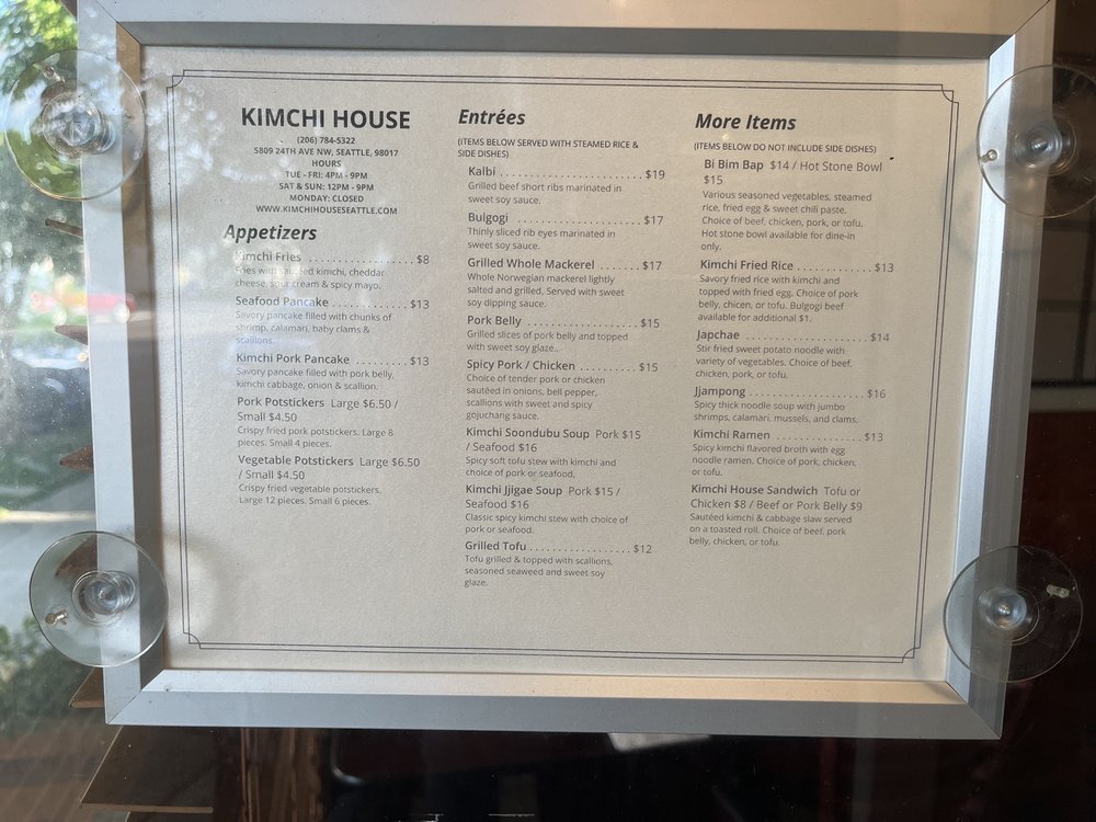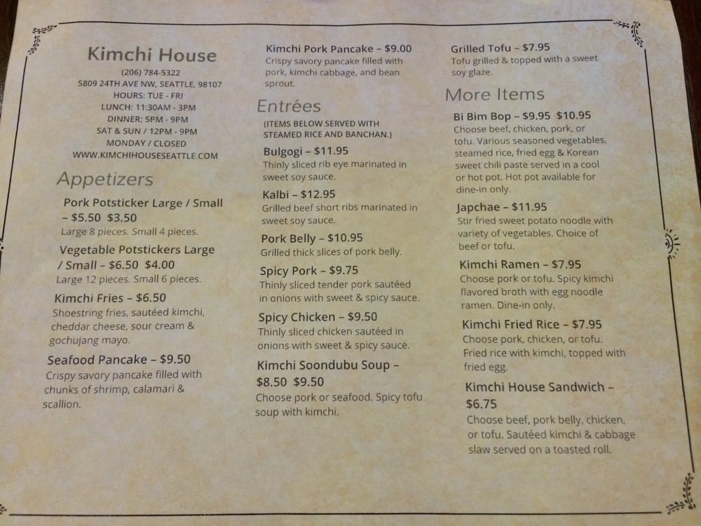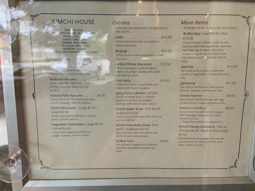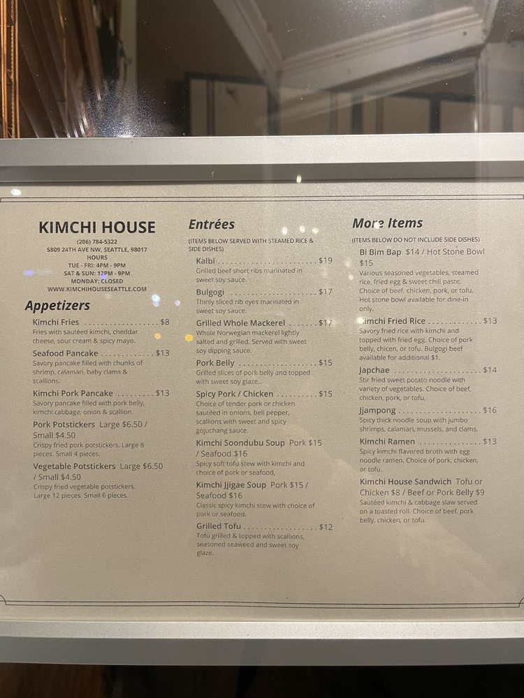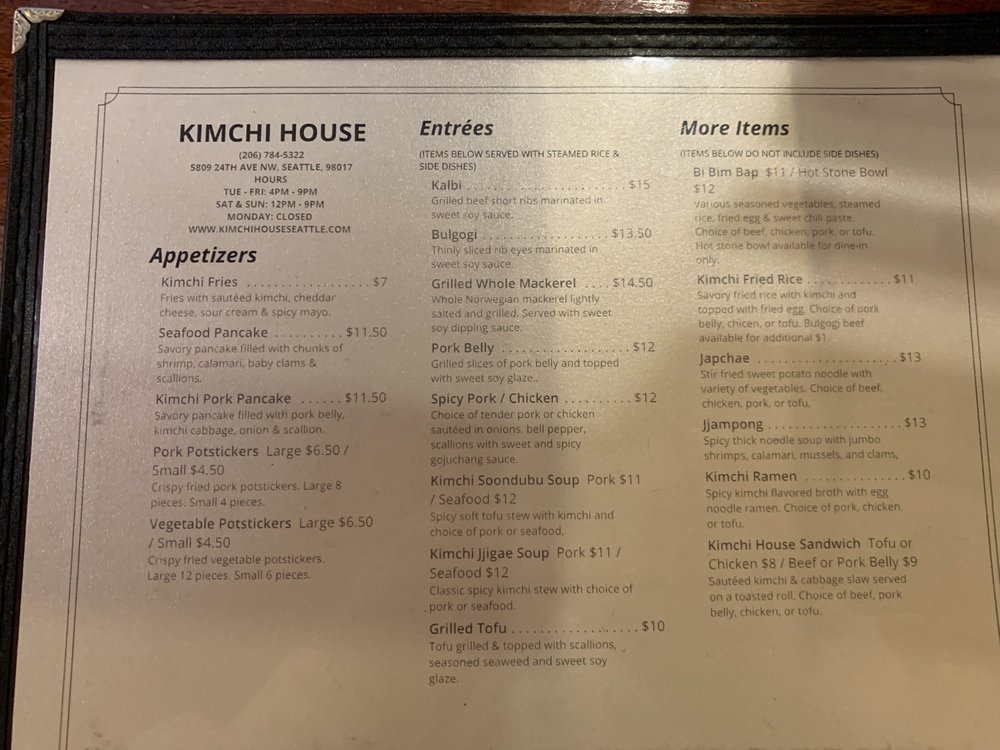 Kimchi House in Seattle offers a variety of Korean dishes with a focus on quality and flavor. The menu includes favorites like Bulgogi and seafood pancake, praised by customers for their taste and authenticity. The charming atmosphere makes dining a pleasant experience, with friendly staff and accommodating service. The kimchi pork pancake and pork belly are standout dishes, perfect for sharing among friends. The attention to detail, from the flavorful banchan to the comforting seafood jigae and bibimbap, ensures a memorable meal. The restaurant's cozy ambiance and reasonable prices make it a hidden gem in the local dining scene. Overall, Kimchi House exudes warmth and home-cooked goodness, making it a must-visit spot for Korean cuisine lovers.